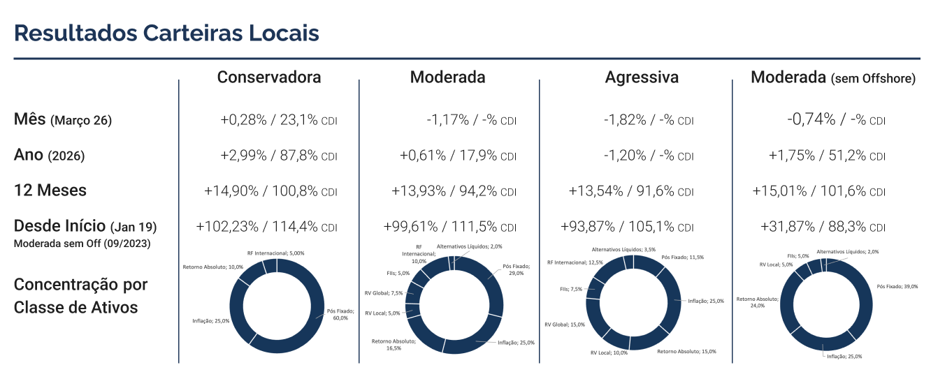 Em março, observamos um momento de queda relevante nos portfólios locais e internacionais. Isso é reflexo de um movimento de abertura abrupta das curvas de juros e de queda relevante nos ativos de renda variável, tanto locais quanto internacionais. A quebra da correlação negativa entre o desempenho das classes de Renda Fixa e Renda Variável promove um cenário de difícil proteção dos portfólios.