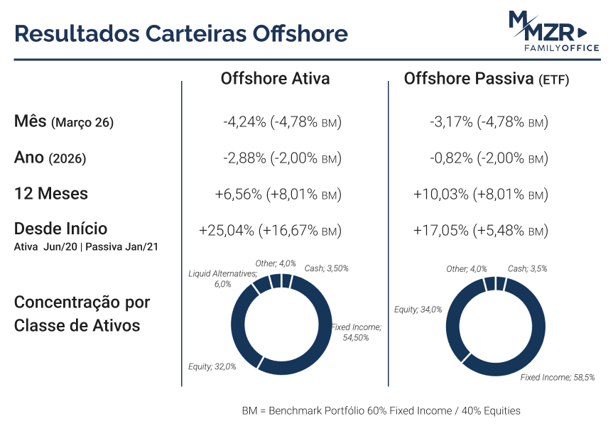 Os portfólios internacionais apresentaram em março o segundo pior desempenho mensal da história, melhor apenas do que a queda de setembro de 2022, ano em que os ativos refletiram preocupações em relação à intensidade ritmo do aperto monetário das economias desenvolvidas. No mês de março o que observamos foi uma reação brusca na precificação das classes, principalmente nos mercados de renda fixa com o mercado passando a projetar necessidade de retomada no ciclo de aperto monetário. Tal cenário lembrou o ano de 2022, com poucas alternativas de “defesa” e dificultando a leitura para frente (por sua vez dependendo de como será a resolução do conflito geopolítico). Apesar da queda expressiva do portfólio, o desempenho do mesmo superou o “60/40” (que caiu 4,8% em março) justificado pela maior ponderação em Estados Unidos, tanto nas classes de risco quanto na renda fixa. Em Equities, as estratégias que se mostraram mais “defensivas” em comparação com queda de 7,4% do índice MSCI foram US Small Caps (-4,0%) e US Value (-4,1%). Por outro lado, os destaques negativos na classe ficaram para as estratégias Global Growth (-10,3%) e Emerging Markets (-8,8%). Na classe de renda fixa, apesar de nenhuma estratégia ter encerrado o mês no positivo, as menores quedas foram as dos títulos indexados ao CPI americano e gestão ativa de crédito HY (devido à menor duration do portfólio) caindo 1,5% e 1,3% no mês. Por outro lado, o destaque negativo ficou para a estratégia que investe em títulos públicos do Reino Unido (UK GILTS), a qual iniciamos alocação nos portfólios globais ao longo de março. Dentre os Hedge Funds, os destaques negativos ficaram para as estratégias Multi Strategy e Trend Following, resultado na mudança das expectativas que estavam sendo precificadas nos últimos meses para as diversas classes, dificultando as leituras dos gestores e dos modelos quantitativos. Por fim, na classe de ativos reais, a estratégia de criptomoeda encerrou no campo positivo, compensando em parte a queda de dois dígitos das estratégias de urânio e minerais críticos.