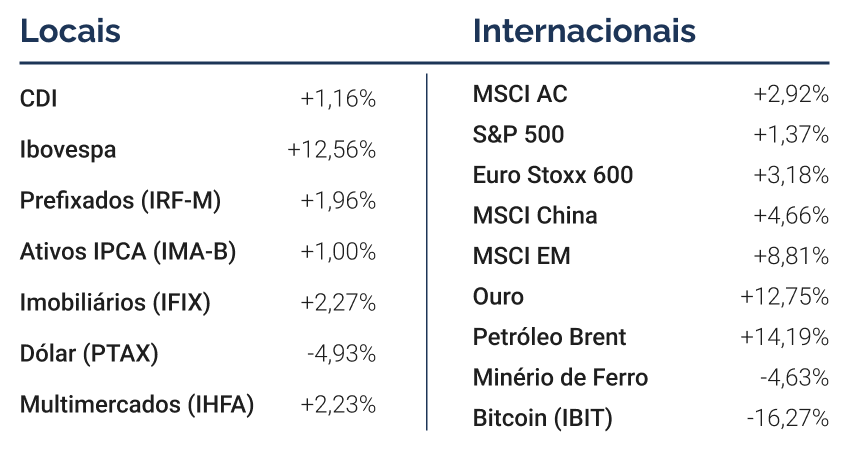 Não por acaso, ao analisarmos a atribuição de performance do Ibovespa, observa-se que a alta esteve concentrada principalmente nas ações de maior peso no índice. Petrobras avançou 23%, Vale subiu 21,5%, Itaú Unibanco registrou alta de 16%, Bradesco 17,3% e B3 19,5%. Do ponto de vista setorial, também se destacaram positivamente os segmentos de Educação (+34%), Agronegócio (+14,9%) e Shoppings (+13,1%), enquanto o desempenho negativo ficou concentrado no setor de Papel e Celulose, com queda de 2,4%.