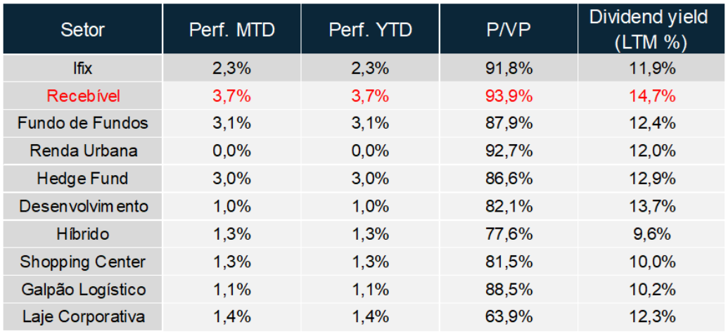 Analisando a divisão entre os fundos de Papel e Tijolo, voltamos a observar um desempenho superior dos fundos de papel pelo segundo mês consecutivo. Os fundos de papel apresentaram alta de 2,5%, contra 1,60% dos fundos de tijolo. Essa sequência começa a quebrar uma tendência observada ao longo de 2025.