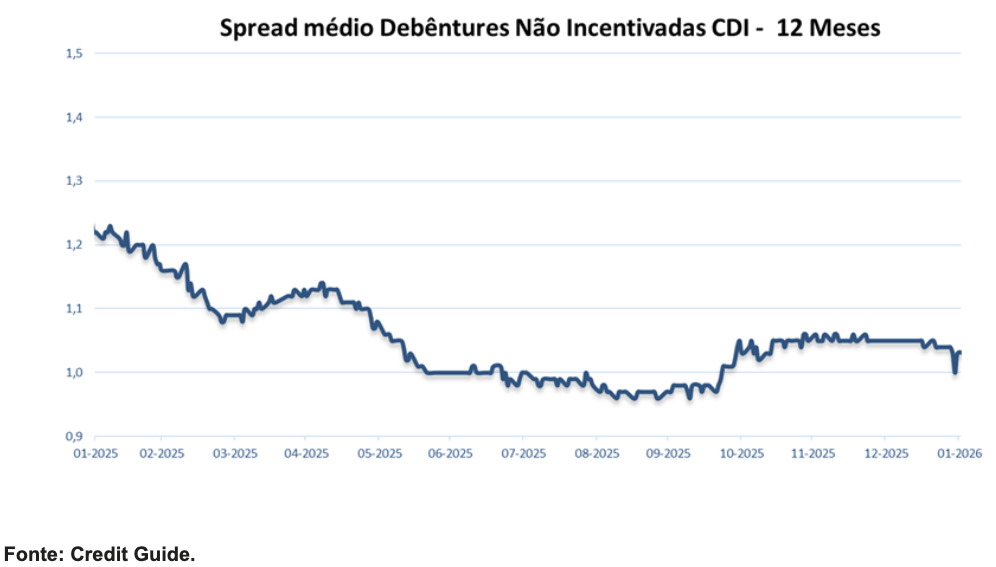 A classe de crédito corporativo foi impactada, em janeiro, por três principais movimentos. O primeiro foi a combinação da pausa nos cortes de juros pelo FOMC e projeções de atividade mais forte para o ano, que trouxe certa pressão às Treasuries, e consequentemente, impactaram as dívidas corporativas. O segundo movimento foi a instabilidade geopolítica trazida por Trump, que, assim como nos ativos renda variável, levou os investidores a buscar maior diversificação geográfica. E, por fim, a abertura da curva de juros japonesa diante dos desafios fiscais que o país vem enfrentando.