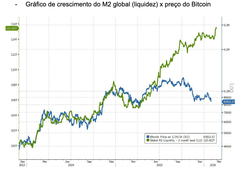 Em resumo, o nosso principal ponto de atenção hoje não está em questionar os fundamentos do Bitcoin, mas sim em acompanhar mais de perto sua relação com a liquidez global. O gráfico abaixo evidencia uma quebra temporária dessa correlação, o que também ajuda a explicar o descolamento observado em relação ao ouro. Vale reforçar que nossa tese de investimento em Bitcoin não se limita a enxergá-lo como uma simples reserva de valor ou uma proxy do ouro, mas como um ativo inserido em uma curva de adoção ainda longa, com múltiplas fontes potenciais de geração de valor ao longo do tempo. Naturalmente, essa trajetória envolve volatilidade. Nesse contexto, a possível mudança na condução da política monetária, com a nomeação de um presidente do Fed mais avesso à expansão de liquidez nos níveis atuais, pode ter contribuído para a correção observada no fim de janeiro e no início de fevereiro. Ainda assim, vale destacar que esse novo presidente é assumidamente mais favorável aos criptoativos e enxerga o Bitcoin como uma tecnologia mais eficiente em diversas frentes.